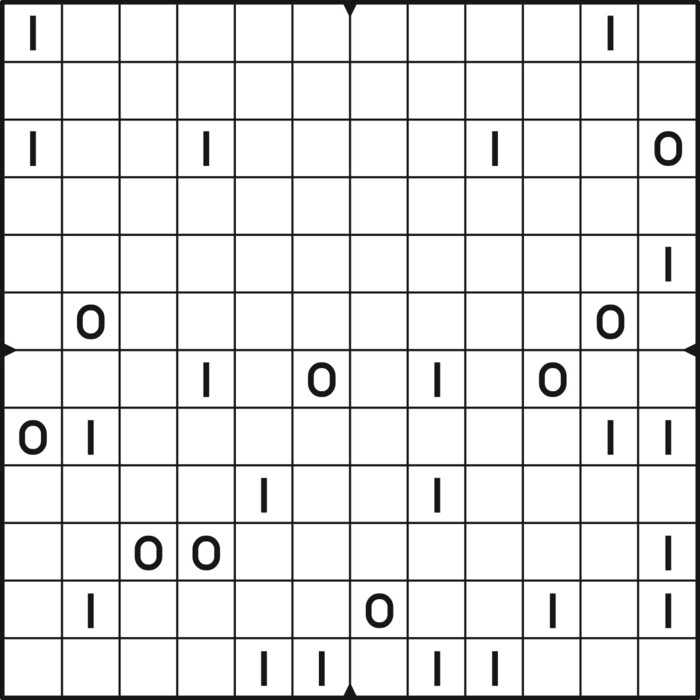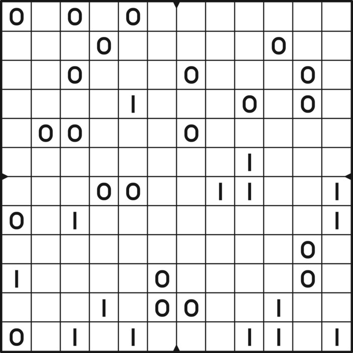 A daily binairo puzzle! Solve each puzzle with only 0's and 1's. Remember: No more than two the same numbers may be placed directly next to or below each other. Every row and every column must contain as many zeroes as ones. The combination of zeroes and ones in every row must be unique, as does the combination in each column.