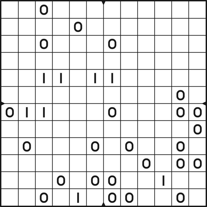 Every Sunday solve a special edition binairo. Remember: Solve each puzzle with only 0's and 1's and no more than two the same numbers may be placed directly next to or below each other. Every row and every column must contain as many zeroes as ones. The combination of zeroes and ones in every row must be unique, as does the combination in each column.